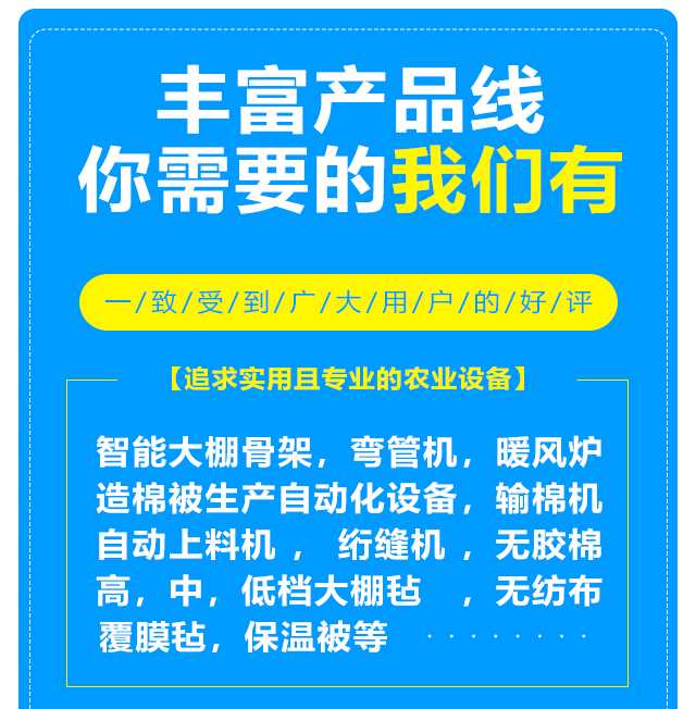 本公司設(shè)備齊全,可生產(chǎn)智能大棚骨架,彎管機(jī),暖風(fēng)爐等農(nóng)業(yè)設(shè)備,另制造棉被生產(chǎn)自動(dòng)化設(shè)備,自動(dòng)上料機(jī),輸棉機(jī),絎縫機(jī)等。質(zhì)量可靠,注重創(chuàng)新。公司擁有雄厚的實(shí)力,先進(jìn)的生產(chǎn)線,豐富的經(jīng)驗(yàn),可根據(jù)客戶的要求定做高,中,低檔大棚氈,無(wú)紡布,無(wú)膠棉,覆膜氈,保溫被等,車間日生產(chǎn)新型棉被10000平方米以上,能滿足各種客戶的需求,新型保溫被產(chǎn)品在國(guó)內(nèi)研發(fā)中始終保持在前列。